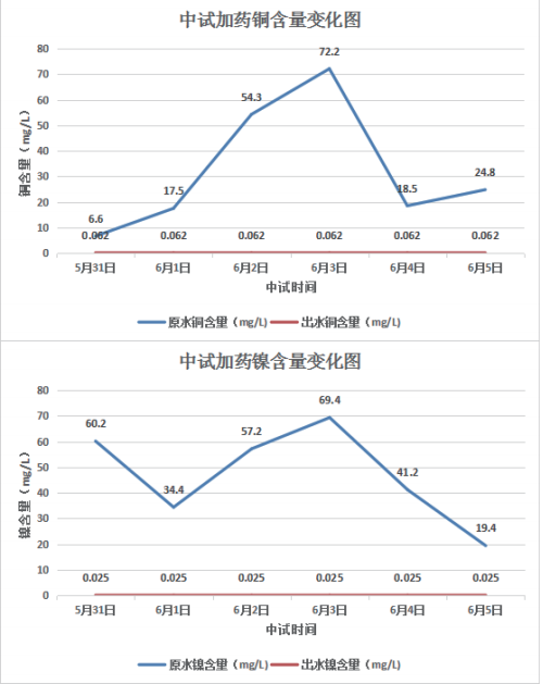 1.在投加破絡(luò)劑總量為850kg,重金屬捕捉劑總量為100kg時,出水總銅穩(wěn)定在0.062mg/L,總鎳穩(wěn)定在0.025mg/L,達到排放標準。